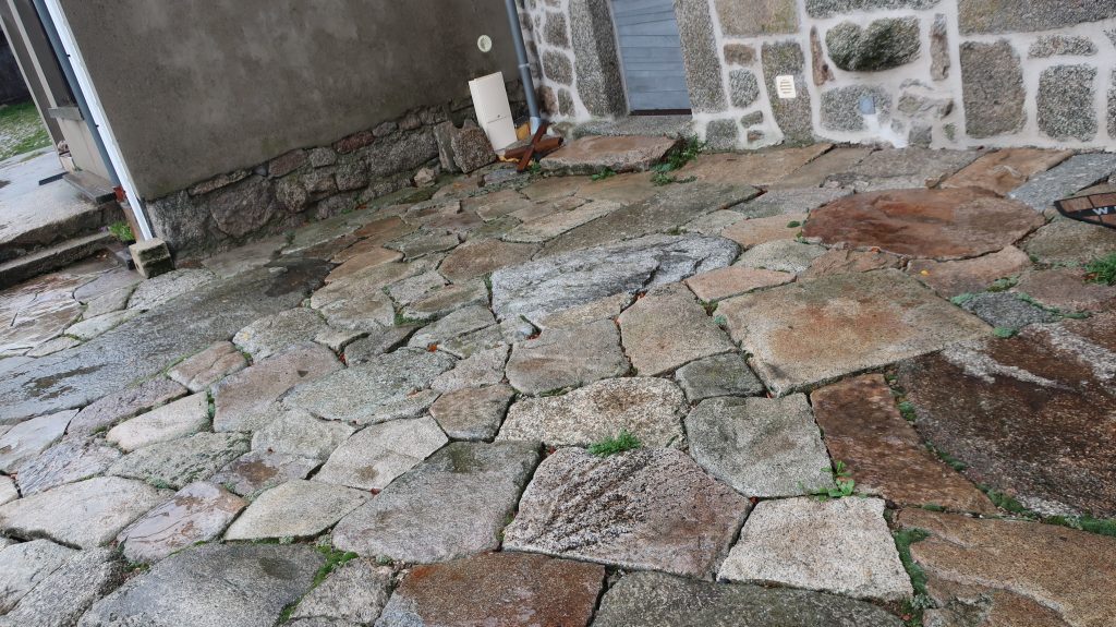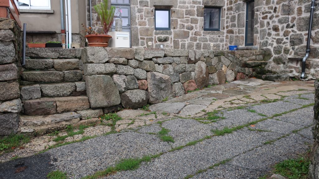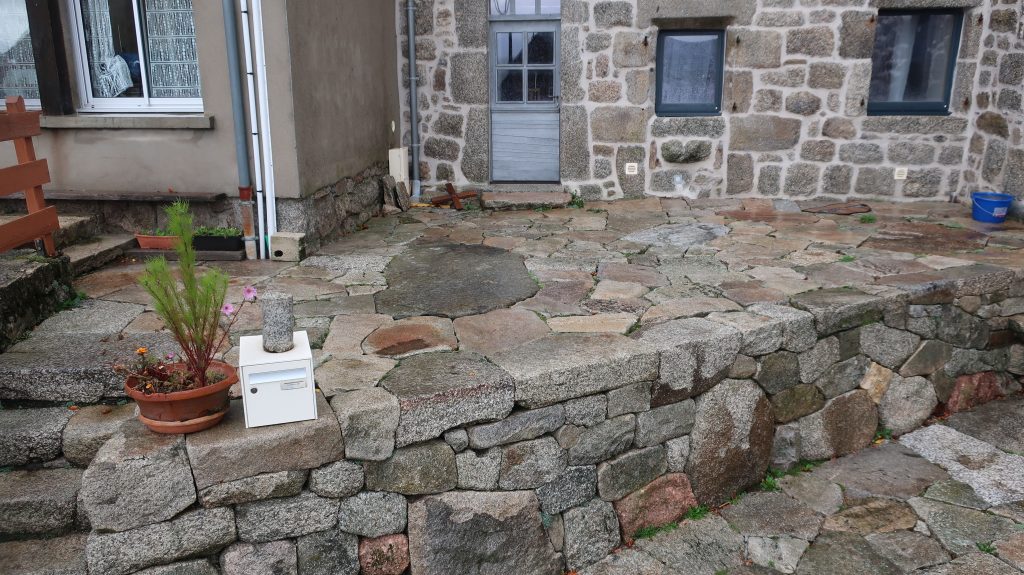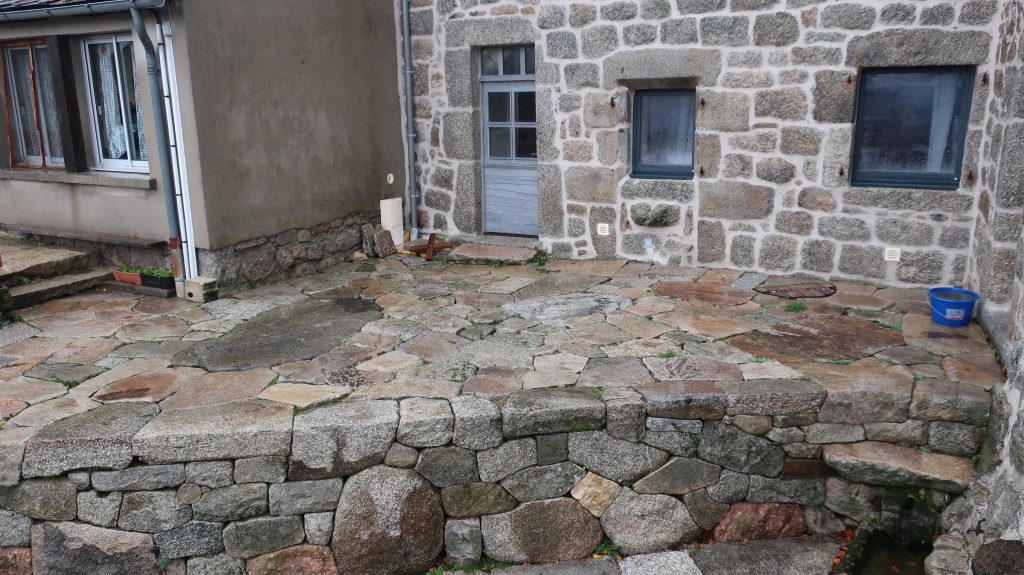 Création d’un mur de soutènement et d’un dallage en pierre sèche devant un gîte privé.